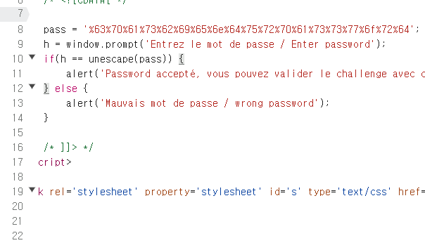 소스코드를 살펴보니 8번 문구가 수상하여 보니까 난독화된 문자열들이 보인다.